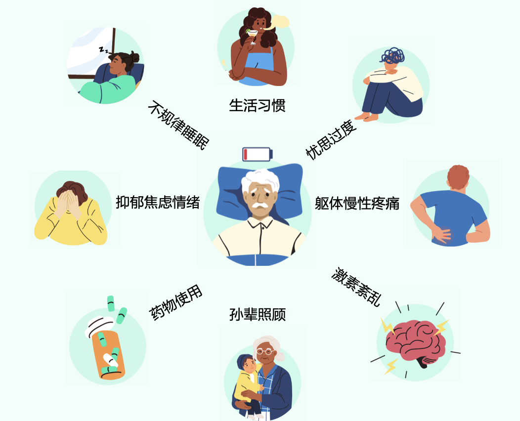 据四川省卫健委资料显示,随着年龄的增长,中老年人睡眠时间从正常的7-8小时缩短至5-6个小时,并且出现睡眠能力下降、睡眠节律紊乱、睡眠时相改变等问题,而导致此类睡眠问题出现的原因主要包括以下几个方面: