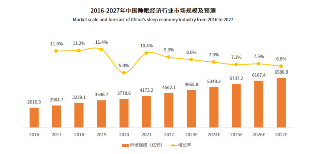 另据《2023-2024年中国睡眠经济行业发展与消费需求研究报告》指出,2016-2022年间,我国睡眠经济整体市场规模从2616.3亿元,增长至4562.1亿元,预计2027年这一数字将达6586.8亿元。在这其中,规模日益庞大的银发族无疑已成为睡眠经济重要的目标人群。