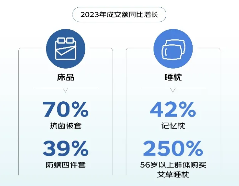 据京东研究院发布的数据显示,2023年改善睡眠质量的床上用品(如抗菌被套、睡枕)成交额同比增长70%,助眠睡衣和功能床垫成交额分别增长110%和299%。