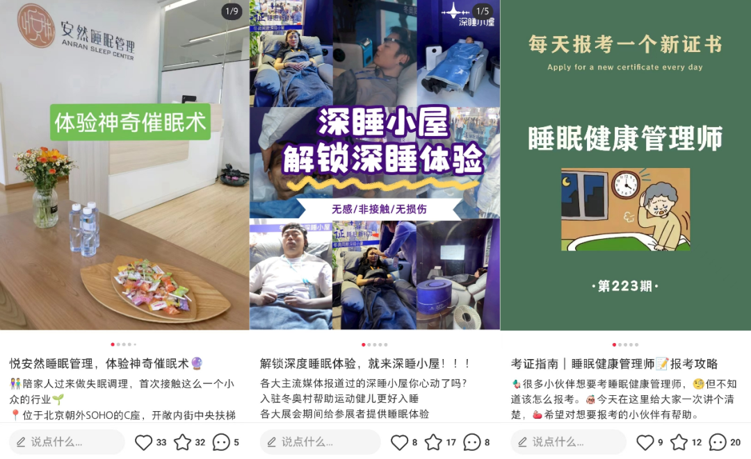 睡眠经济蓬勃发展下,也催生出了不少新场景和新业态,比如睡眠疗愈馆、睡眠体验师等。在小红书上搜索相关关键词,会出现不少类似“深睡小屋”、“睡眠管理师”等的新型业态和职业。