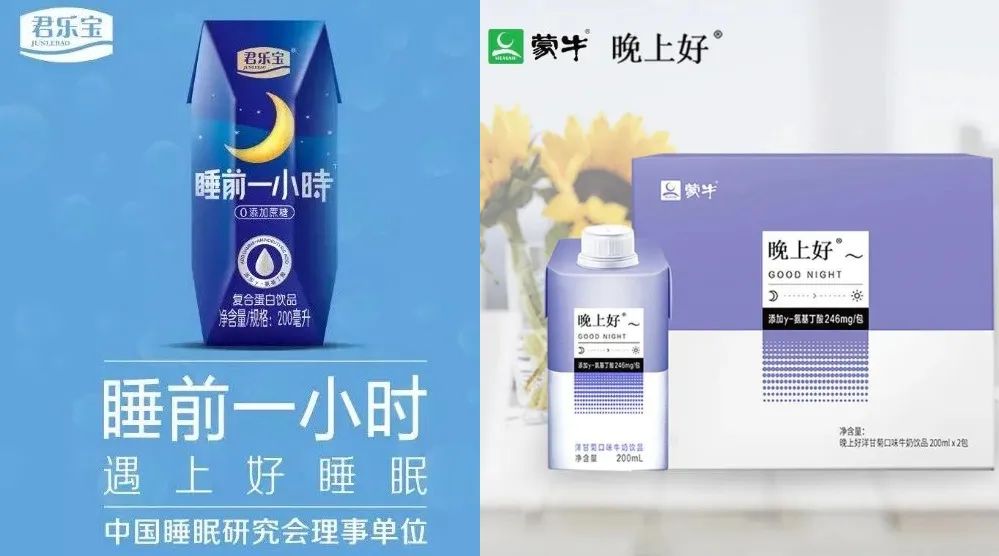 两者都属于存在于动植物体内的氨基酸,能够起到镇静神经、抗焦虑的作用。随着助眠营养品市场的不断发展,不少品牌以饮料、牛奶等形式为包装,将这一新型成分带到消费者面前。如君乐宝推出的复合蛋白饮品“睡前一小时”,蒙牛推出的“晚上好”等,均包含了Y—氨基丁酸成分。