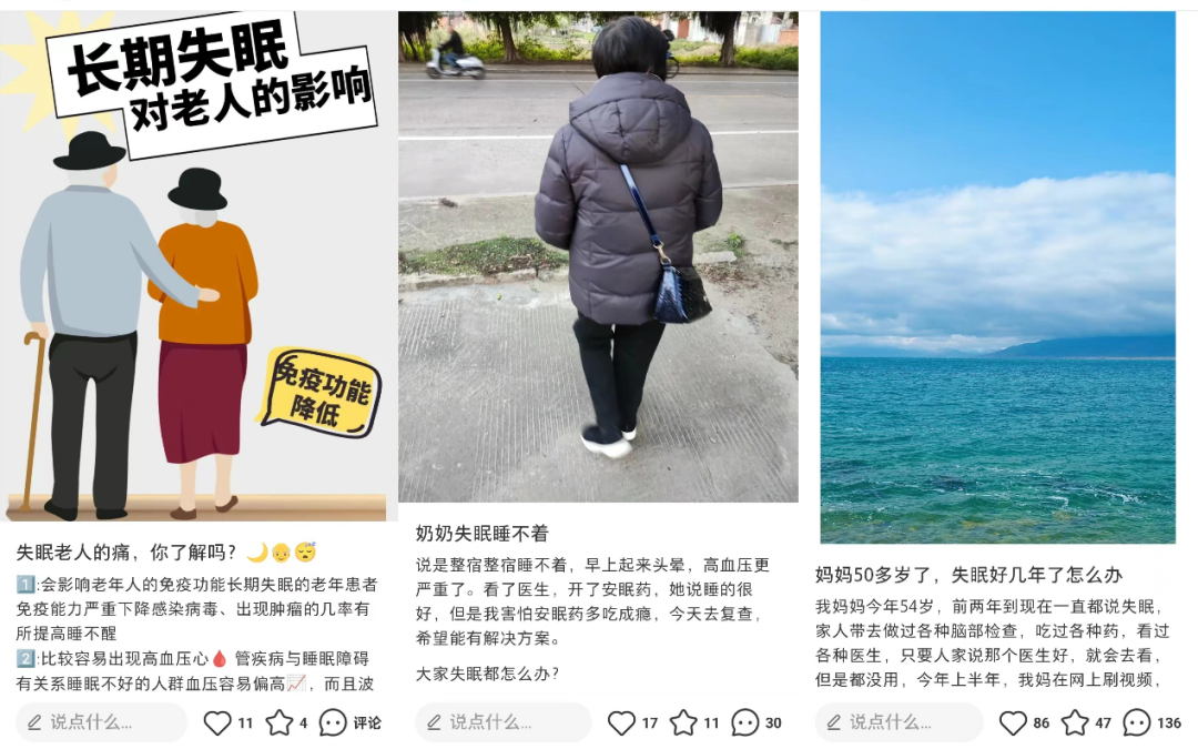 “奶奶整晚失眠睡不着”、“妈妈失眠好多年了怎么办”……社交平台上,聚集了大量被睡眠问题困扰的中老年以及他们的子女。有人将自己的失眠和治疗经历整理成长文,与网友交流,也有人通过专业视角,为网友科普长期失眠带来的隐患及解决方案。