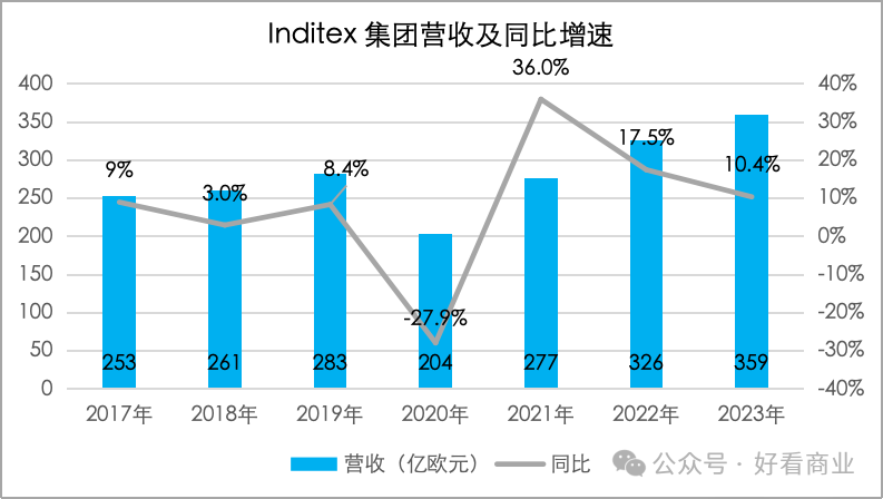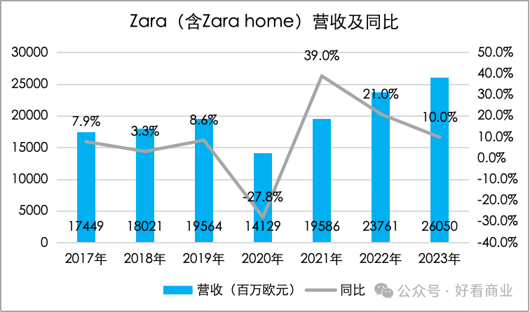 2017-2019年,Zara营收仅实现个位数增长。2018年其营收同比仅增长3.3%,2020年更是因疫情等原因同比大降27.8%。
