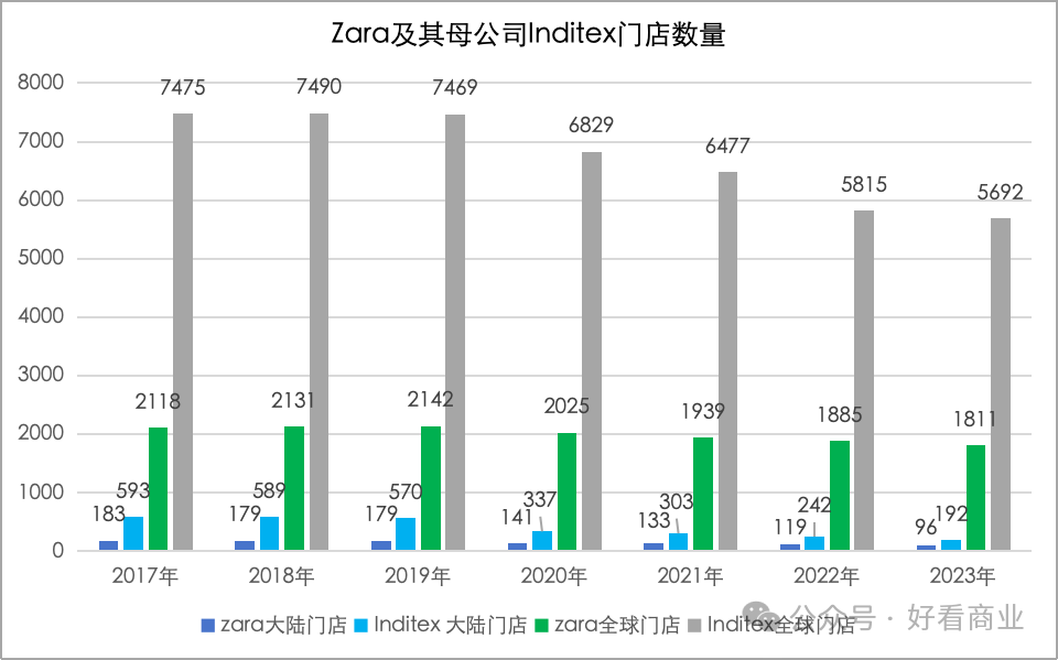 Zara是Inditex集团旗下门店最多、营收占比最大(超七成)的品牌。仅2023年,Inditex集团在大陆至少关掉了50家店,年底只剩192家店;而2019年时,其在大陆的门店多达570家,相当于2/3的店没有了。