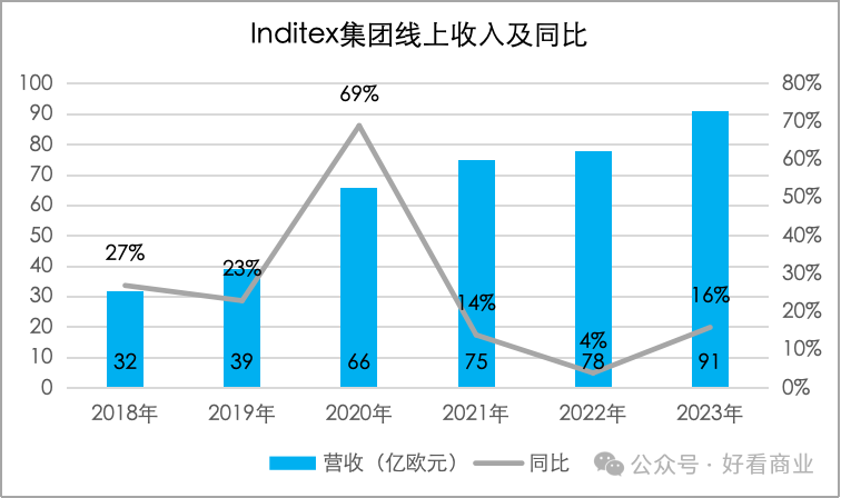 除了提升门店平效,支撑Inditex大量关店的另一重底气来自线上销售的增长和营收占比扩大。2023财年,Inditex集团线上收入91亿欧元,在总收入占比25.35%。