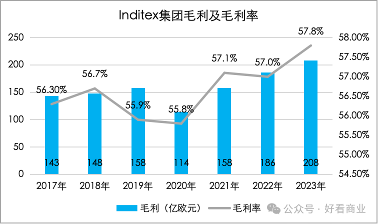 Zara不仅重拾增长态势,也保住了毛利。2023财年,Inditex集团实现208亿欧元毛利,并以57.8%的毛利率创多年来新高;过去三个财年其毛利率均保持在57%以上。