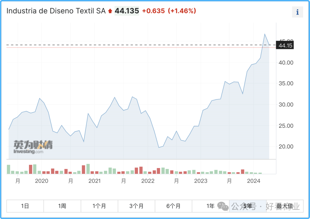 受强劲业绩刺激,Inditex股价接连创新高,过去两年涨幅超150%,目前市值1372.6亿欧元。