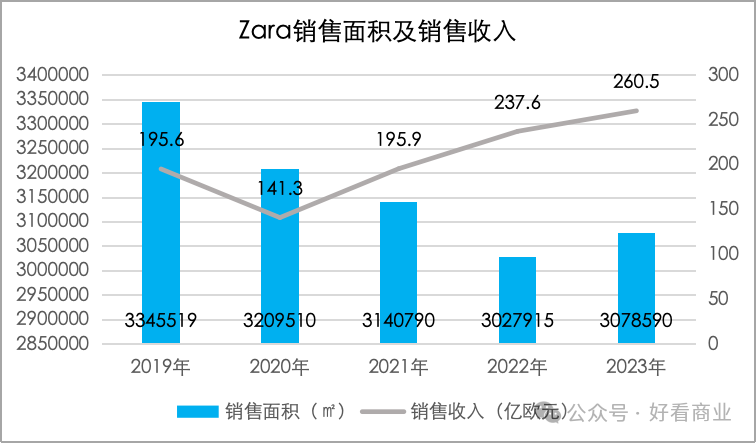 的确,随着Inditex对旗下门店的扩建和翻新,店铺平效在提升。以2023年为例,Inditex门店销售收入同比增长了7.9%,而销售面积同比只增长了4.5%,门店数量减少了2%。销售收入的增速明显快于销售面积的增速,说明每平方米的收入在增加。