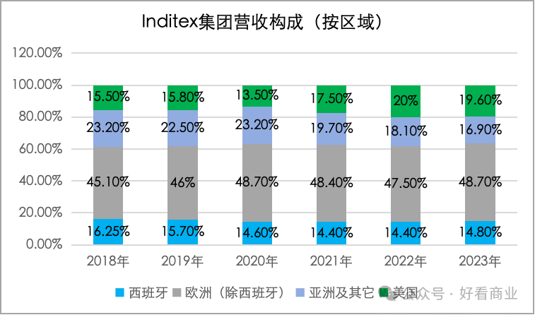 2023财年,Inditex的总营收中,亚洲及其它市场占比从2018年的23.2%降至6年来新低——16.9%。美国市场的收入占比却从2020年的13.5%升至2022年的20%,2023年达到19.6%。