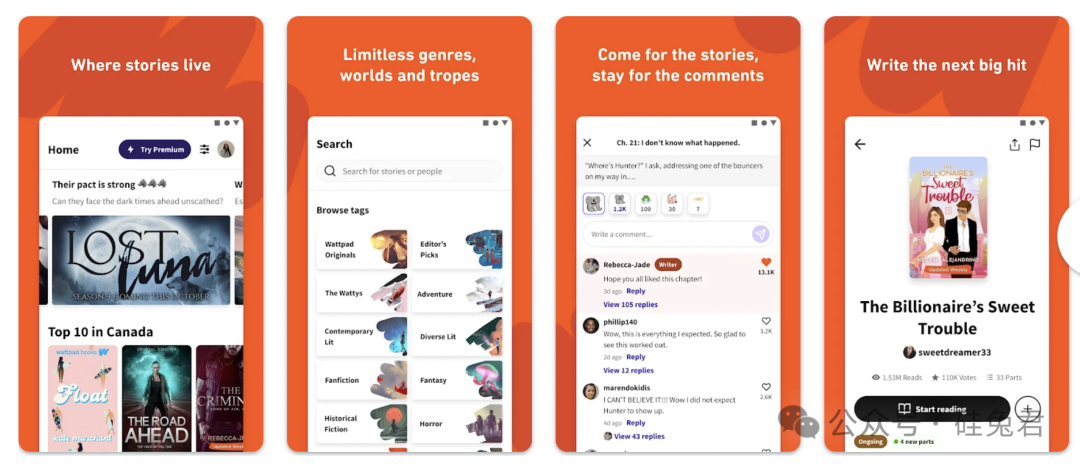 作者可以在Wattpad上以各种体裁和主题创作原创故事,由平台来帮助作者被发现和壮大自己的读者群,像是最初发布在Wattpad上的故事“After”和“The Kissing Booth series”都已经被Netflix改编成了大热影视。