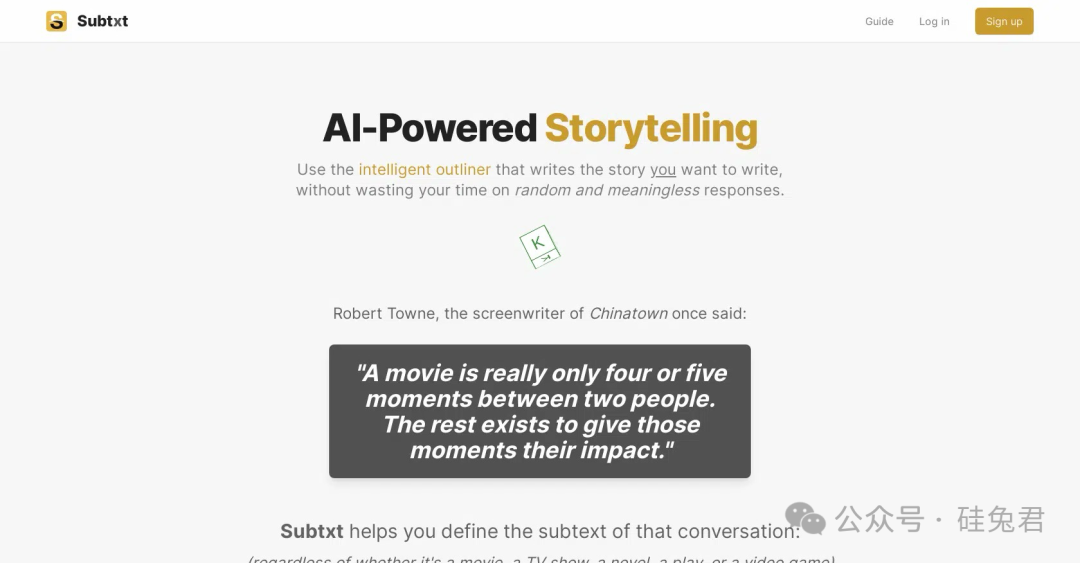Subtxt的AI写作指导Muse可以帮作家们将简单的概念发展成完整的故事情节,或提供建议让主人公的背景和性格更加丰满,像是迪士尼和华纳等公司都使用过Subtxt来帮助优化其创意过程。