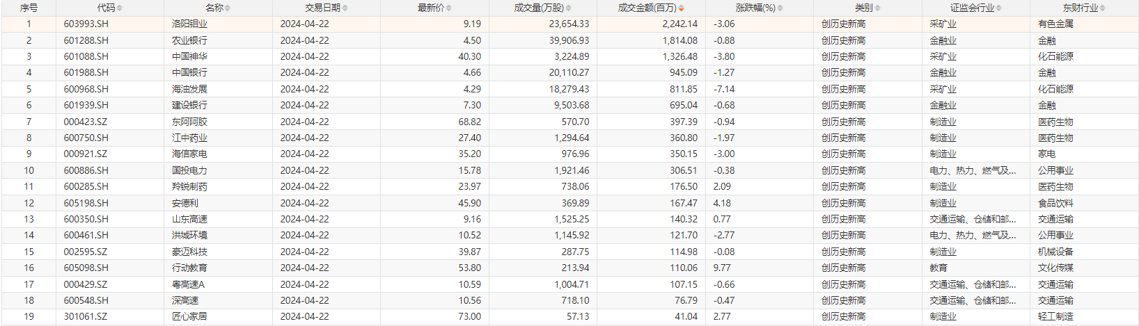 每日创新高个股统计:今日19只个股股价创历史新高,主要分布在化石能源、交通运输等行业