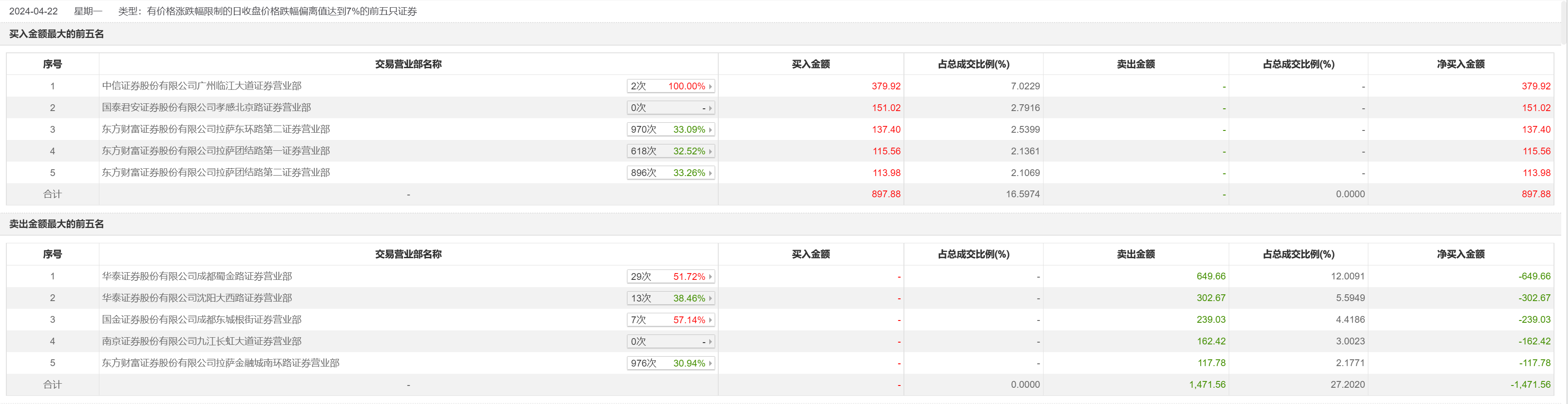 具体来看,华泰证券成都蜀金路证券营业部、华泰证券沈阳大西路证券营业部分别卖出649.66万元、302.67万元;中信证券广州临江大道证券营业部、国泰君安证券孝感北京路证券营业部分别买入379.92万元、151.02万元。