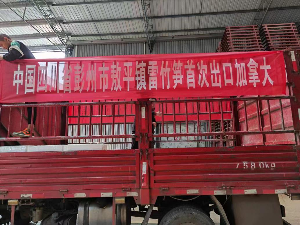 彭妹妹了解到,2023年4月11日一辆悬挂着“中国四川省彭州市敖平镇雷竹笋首次出口加拿大”横幅的车辆,载着500余斤雷竹笋从彭州出发,到达天府国际机场报关出口,在获得锦城海关签发的植物检疫证书后,经过12个小时的飞行顺利抵达了加拿大,实现了成都市首次对加拿大出口雷竹笋,也是四川省首批规模化种植雷竹笋出口。