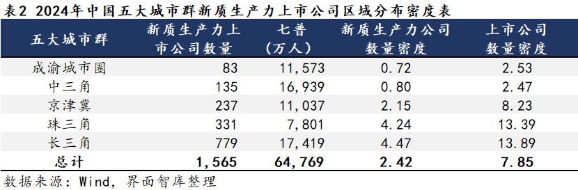 4、新质生产力上市公司区域密度:长三角与珠三角居前,成渝与中三角有待加强