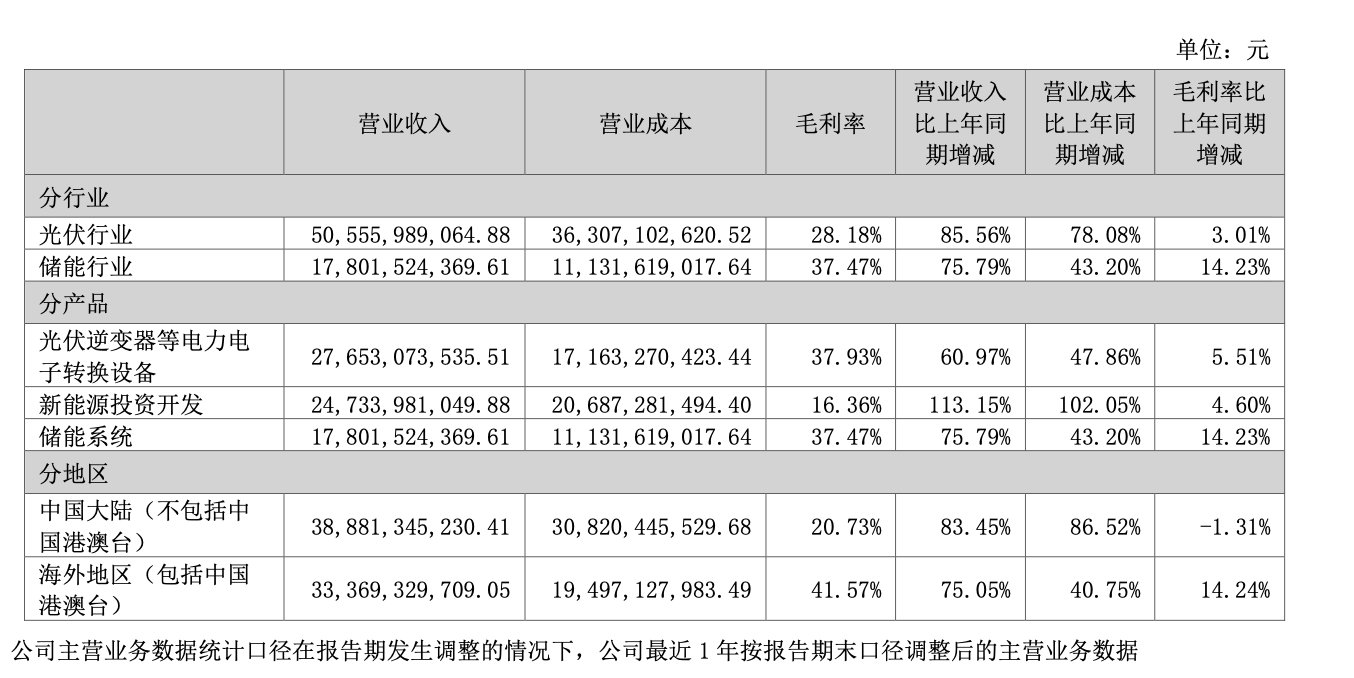 阳光电源的中国大陆收入占比约54%,海外地区收入占比约46%。海外毛利率达41.57%,较中国大陆地区高出约20个百分点,同比增长14.24个百分点。
