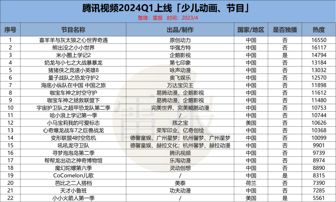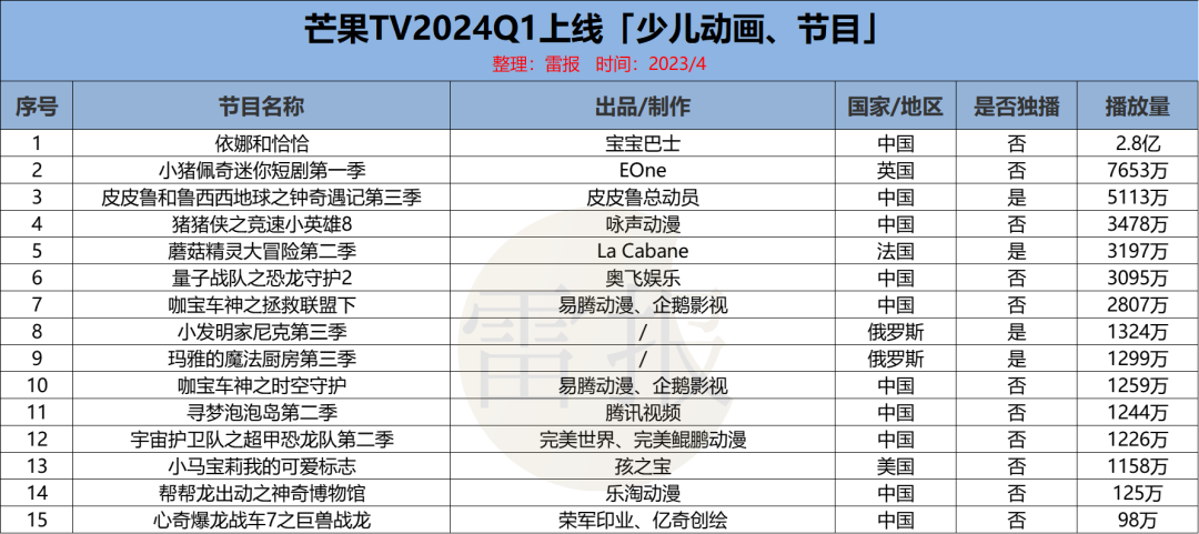 前段时间,雷报统计过2023年全年“爱优腾芒”上新少儿动画情况,从中看到各大平台都在加码少儿赛道的投入,并拓展自己的版权动画。