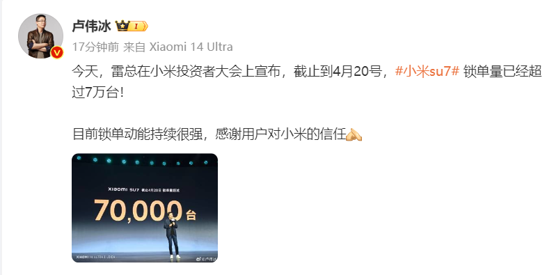 小米集团总裁、小米品牌总经理卢伟冰4月23日在微博发文,雷军在小米投资者大会上宣布,截止到4月20号,小米SU7锁单量已经超过7万台; 2024年小米SU7交付目标超过10万辆。