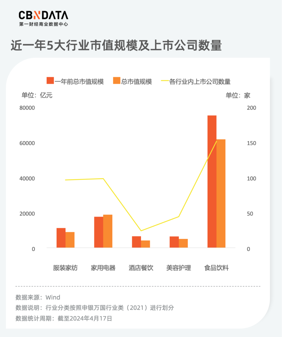 在头部公司方面,截至2024年4月17日,5个行业中,市值在500亿元、千亿元以上的国内消费类上市企业数量分别为12家、16家。与去年同一时间相比,仅技术密集型的家用电器行业在数量上有所提升,其中美的等“白电三巨头”名次均有上涨。而服装家纺、食品饮料等快消企业数量多有下滑,并且去年唯一加入千亿军团的美容护理公司——爱美客也随着股价下跌等因素跌破了千亿市值。