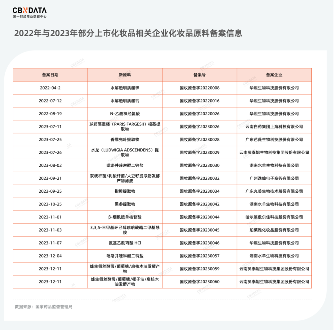 此外,以往重营销轻研发的化妆品公司在过去一年开始“转性”,除研发费用逐年递增外,在研发创新方面还开启了原料“造芯”的战争。据国药监系统数据,化妆品新原料备案数从2022年的42个增加至2023的49个。其中,绝大多数上市企业在2023年完成备案,拿下“主动权”。