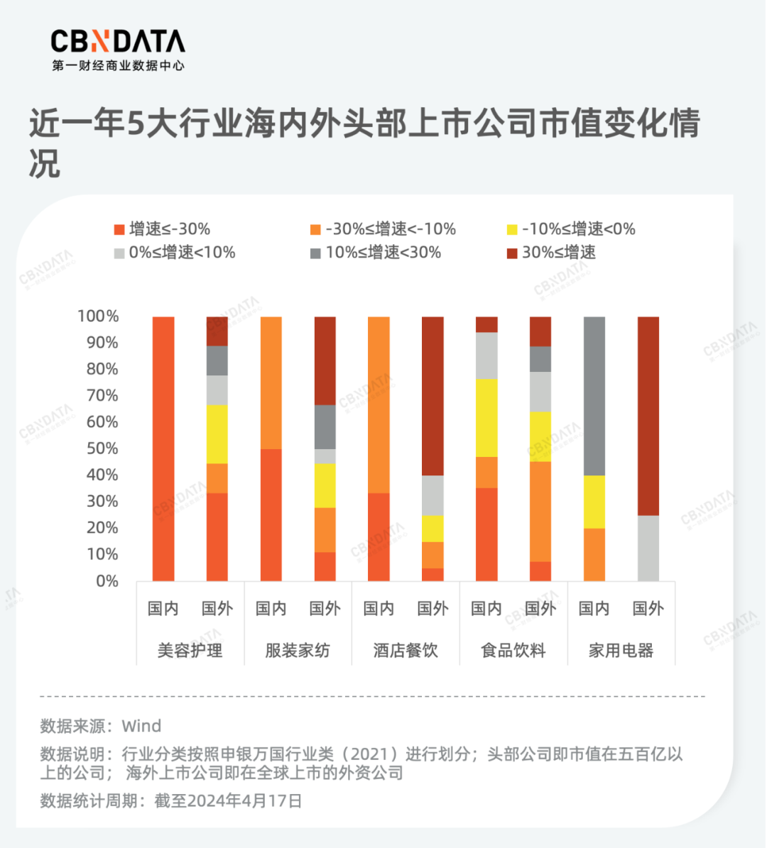 与国际头部上市公司相比,不难发现我国龙头企业与其正逐渐拉大市值差距。国内美容护理、服装家纺、酒店餐饮行业的头部企业近一年时间内市值均有大幅下跌。而一半以上的外资服装家纺、酒店餐饮企业的市值显著上涨,展现出强大竞争力。相对而言,我国食品饮料和家用电器行业的头部企业的表现“差强人意”,在市值增速上与国际公司仍有差距。