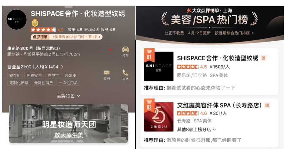 笔者了解到,“SHISPACE舍作”人均消费在1500元左右,店内团购项目的价格低至196元,高至9876元。营业仅3月,门店就登上了大众点评网“上海美容/SPA热门榜”第一名,销量超过500份,为店铺带来了近70万元的收益。