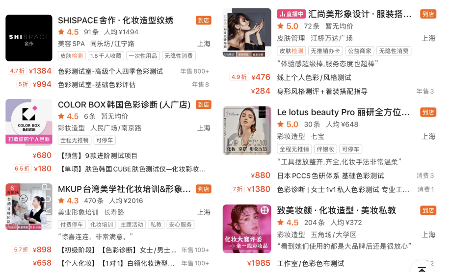 在美团平台上搜索上海“色彩测试”项目,可以发现,有该服务的商家数不超过十家,价格普遍在800-1000元左右,服务时长在2-3小时,除了“SHISPACE舍作”人气较高以外,其他店铺的销售量普遍居于个位数。