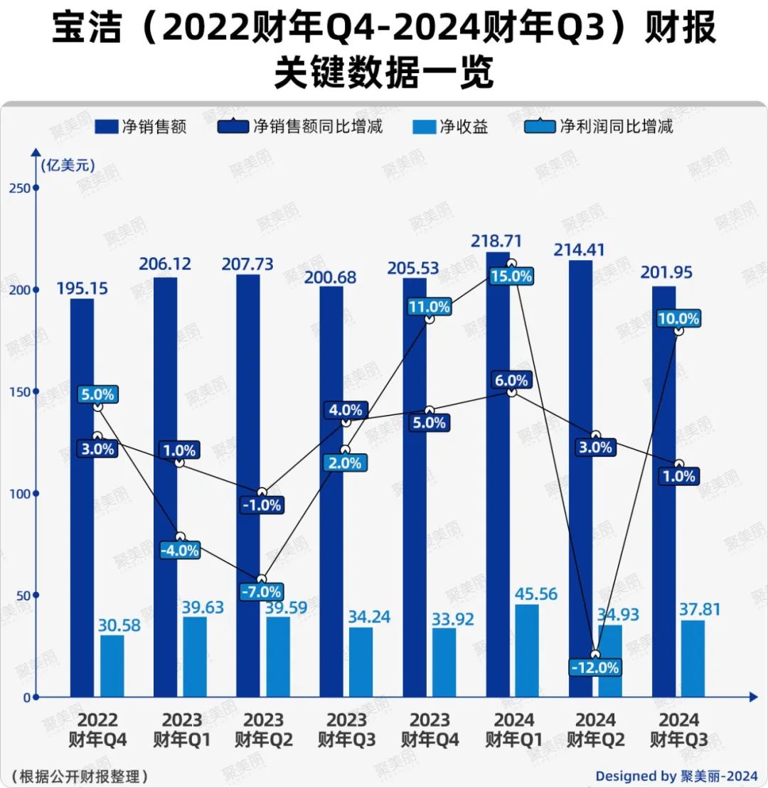 从2022财年Q4-2024财年Q3业绩来看,宝洁本季度的净销售额为倒数第3低。