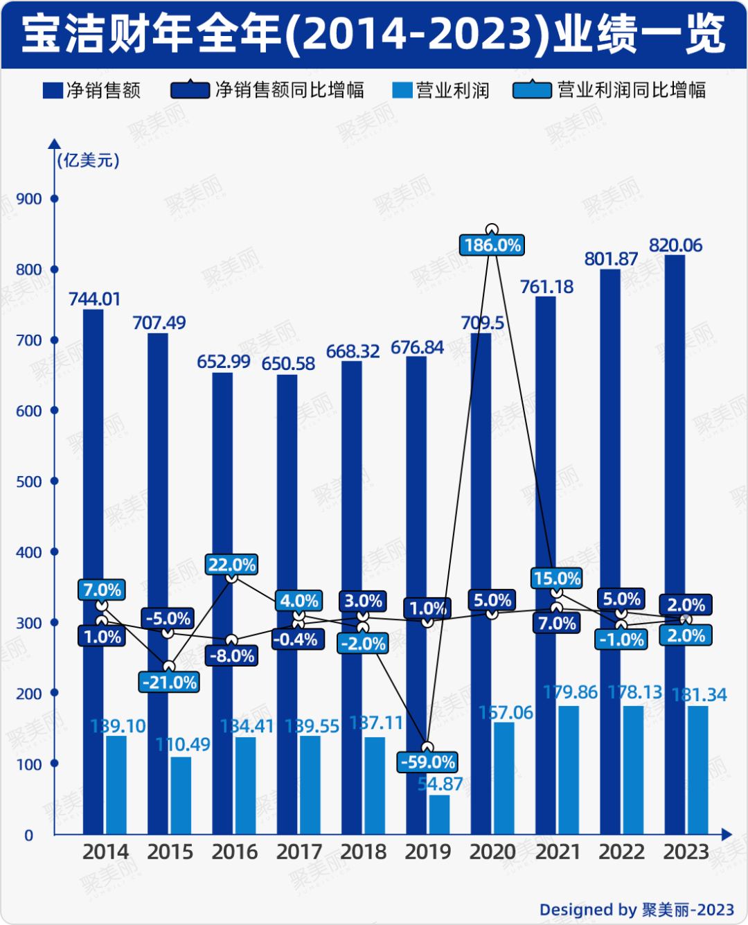 不过,值得注意的是,2023年财年,宝洁净销售额创下了近十年新高。如若达成2024财年指引(保持稳中求进,净销售额增长2%-4%),全年净销售额达984.07亿美元-1148.08亿美元(约合人民币7125.06亿元-8312.56亿元),意味着将迈过7000亿元大关。