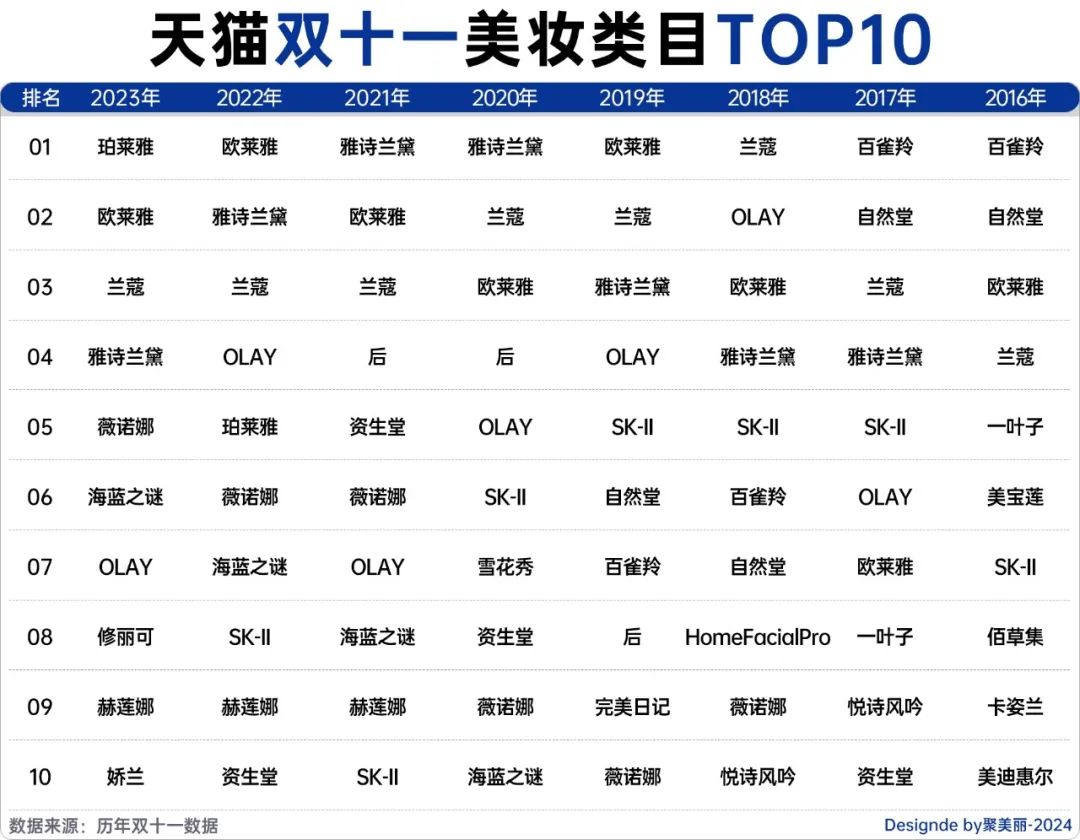 宝洁旗下的高端美妆也是表现不佳。从2016-2023年天猫双11美妆类目Top10榜单来看,Olay曾在2018年位列第2,但之后盛极而衰,2023年仅位列第7,而SK-II更是跌出排名。