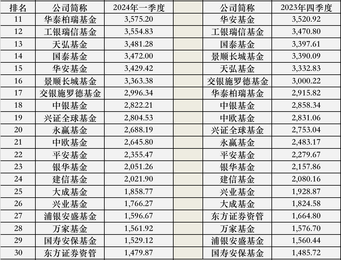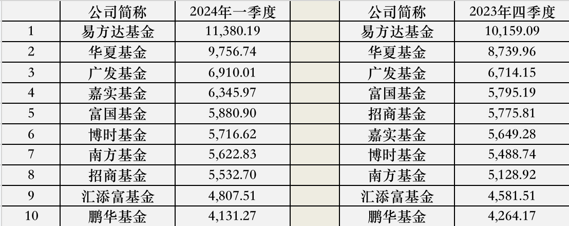前十名中,招商基金从第五位降至第七位,单季度规模减少了243亿元。