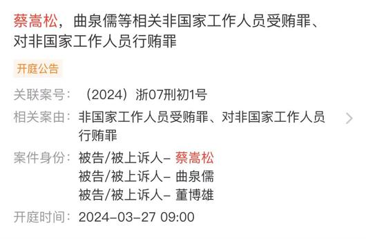 天眼查信息显示,蔡嵩松所涉案件案号(2024)浙07刑初1号,案由为“非国家工作人员受贿罪、对非国家工作人员行贿罪”,已于3月27日开庭,涉案人员还包括诺安基金经理曲泉儒。