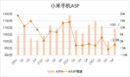 从2022年第二季度开始的七个季度内,仅去年第二季度受小米13Ultra发布,略有抬升外,其余六个季度,小米手机ASP皆同比回落。尤其是去年第三季度,小米ASP多年以后再度破千,为997元,同比下跌5.8%。