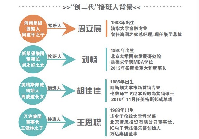 事实上,近几年,“80后”二代接棒的企业比比皆是。去年11月,周成建辞去美特斯邦威服饰所有职务,30岁女儿胡佳佳接任董事长;去年10月,被称为“中国女装第一股”,拥有Ports宝姿女装品牌的宝国国际创始人陈启泰卸任首席执行官,由其子陈俊明接任;2013年,刘永好之女刘畅接任新希望集团董事长,同年,王思聪用父亲王健林给的5亿元“练手资金”,悄声投资出5家上市公司……