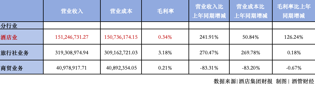 透过其历年财报发现,主营旅行社业务毛利率常年仅保持在3%左右。酒店业务的毛利率在2021年、2022年、2023年分别为11.00% 、-79.08% 、0.34%。