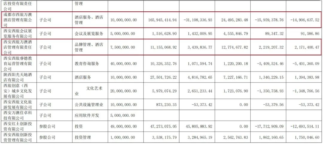 《酒管财经》注意到,作为模式相对偏重的酒店业务,西安旅游控股的与酒店业务相关的子公司,多家处于亏损状态。而其寄予厚望的“万澳系”的业务体量和经营规模依旧有限。