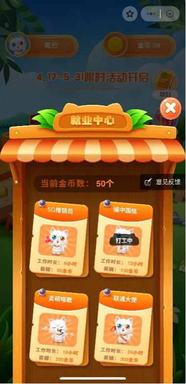 “联通猫舍”游戏还设置兑换中心,建立完善的奖励体系,通过养猫打工赚取金币,设置了不同等级的奖品,方便用户选择,奖品包含联通话费券等卡券商品,还有极具联通特色的文创用品,品类丰富,满足用户喜好。