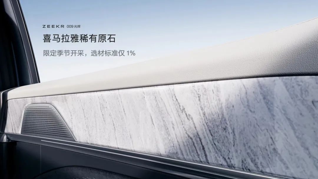 埃尔法和其他豪华车型,都会在内饰上使用实木饰板,来体现豪华感,而极氪009光辉版用的则是来自喜马拉雅山的原石,它被用在了门板、豪华幕墙等位置。据说这种原石每年只有半年的时间可以开采,而且只能在固定的岩层开采,所以每台极氪009光辉版用的原石都是独一无二的。