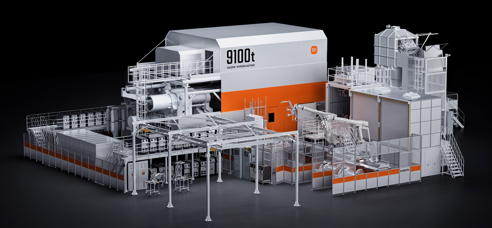 小米自研了“大压铸一体化集群”,设计了一套最适合、最高效的产线,压铸机是根据这套产线的需要由合作伙伴定制。