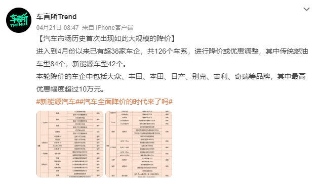 据媒体不完全统计,进入到4月份以来,已有超38家车企,共126个车系,进行降价或优惠调整;其中传统燃油车型84个,新能源车型42个,这是国内汽车市场历史首次出现如此大规模的降价。