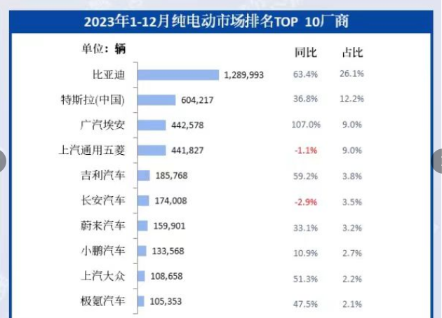 从乘联会公布的数据中,可以看出2023年纯电市场排名中比亚迪位居第一,占比总市场份额的26.1%,而广汽埃安和上汽通用五菱分别排名第三和第四,位于特斯拉之下,占比均为9%。另外,排名第六的长安汽车,其知名度较高的纯电车型长安Lumin售价也在10万元以下。