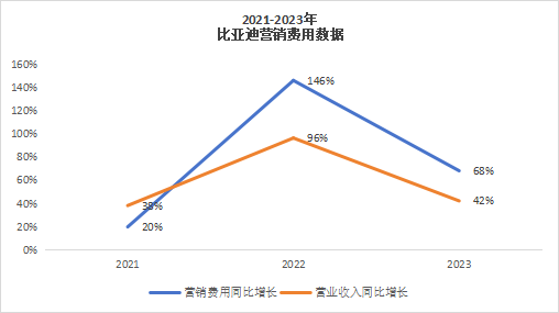 以2022年宣布停产燃油车为节点,2021-2023年,比亚迪营销费用占比营收的比例分别为2.82%、3.54%以及4.18%,有逐步上升的趋势;在这种情况下,从2022年开始,比亚迪营销费用的同比增速就超过了营收的同比增速。