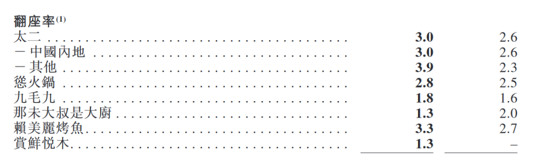 尽管超500家门店的太二酸菜鱼仍居于品类前列,但从九毛九集团的财报来看,太二的吸引力正在下降,其翻座率从2018年的4.9次/天下降到2023年的3次/天。