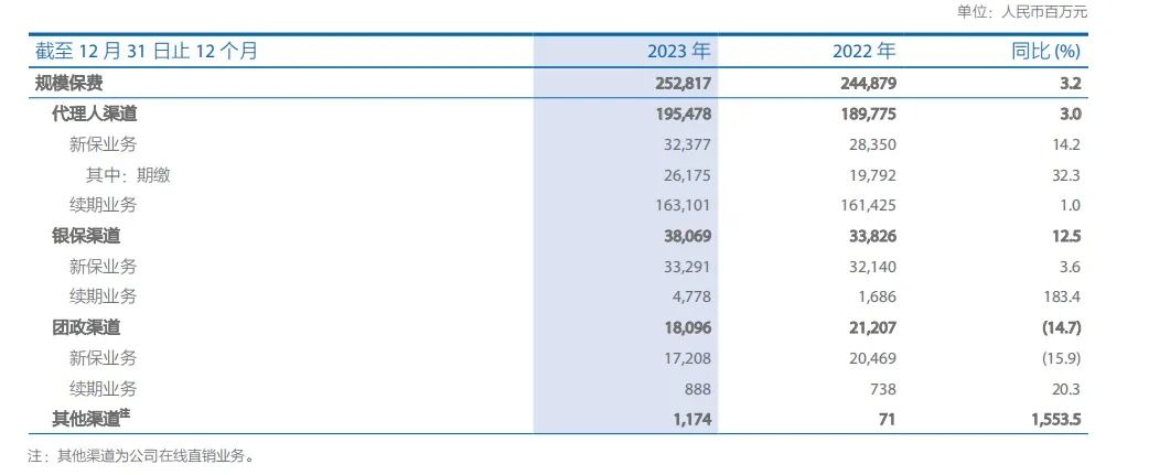 2023 年,太保寿险代理人渠道实现规模保费1954.78亿元,同比增长 3.0%;其中期缴新保规模保费261.75亿元,同比增长32.3%。