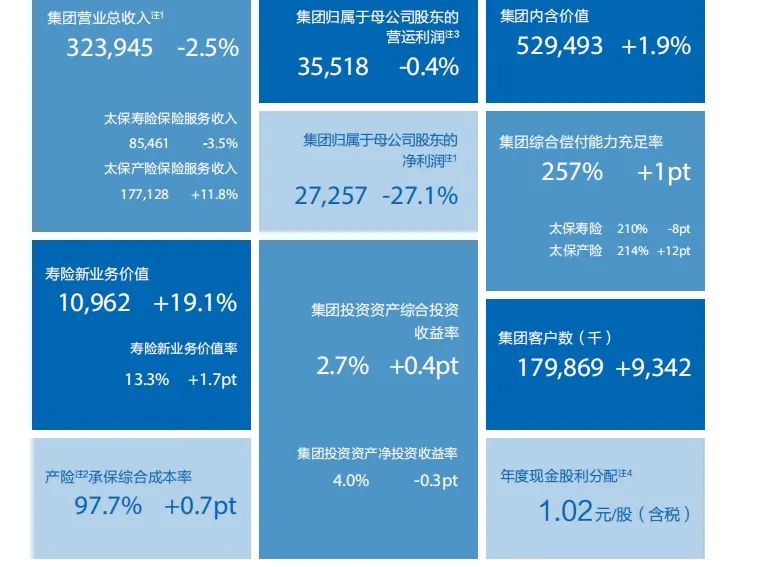 2023年,中国太保营收、净利润双降,实现营业收入3239.45亿,同比下降了2.5%;净利润272.57亿,同比下降27.1%;总投资收益率由4.1%降至2.6%。