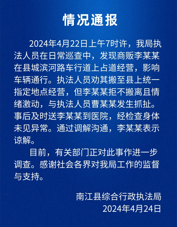 近日,网传四川巴中南江县,多名城管执法人员在集州街道与一名七旬卖菜老人发生推搡,致使老人摔倒在地。4月24日,南江县综合行政执法局发布情况通报称,4月22日上午7时许,我局执法人员在日常巡查中,发现商贩李某某在县城滨河路车行道上占道经营,影响车辆通行。执法人员劝其搬至县上统一指定地点经营,但李某某拒不搬离且情绪激动,与执法人员曹某某发生抓扯。事后及时送李某某到医院,经检查身体未见异常。通过调解沟通,李某某表示谅解。目前,有关部门正对此事作进一步调查。