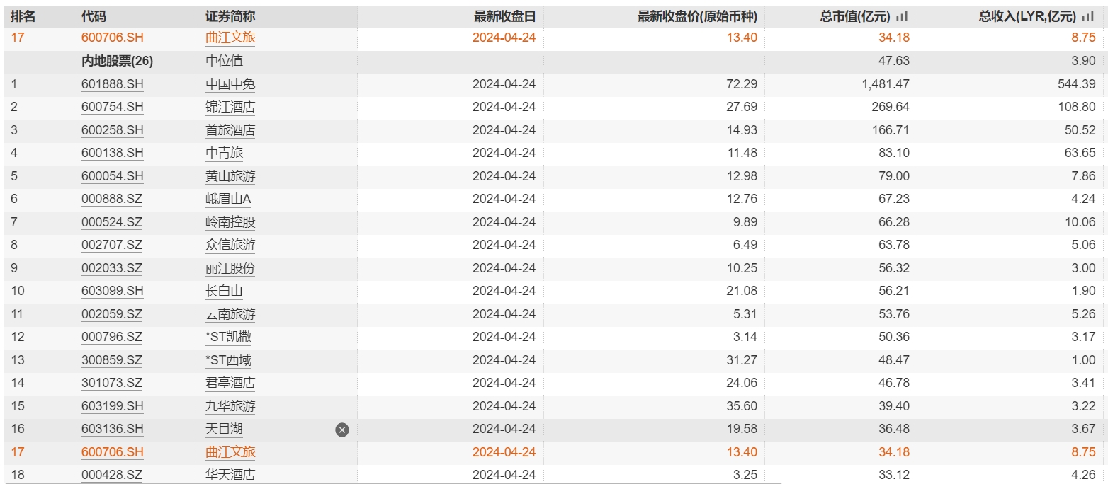 Wind数据显示,通过同业综合比较,截至4月24日,曲江文旅在26家同行个股中排名第17位,参考指标包括总市值、总收入、ROE、Beta(最近100周)、最新收盘价。