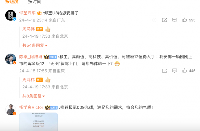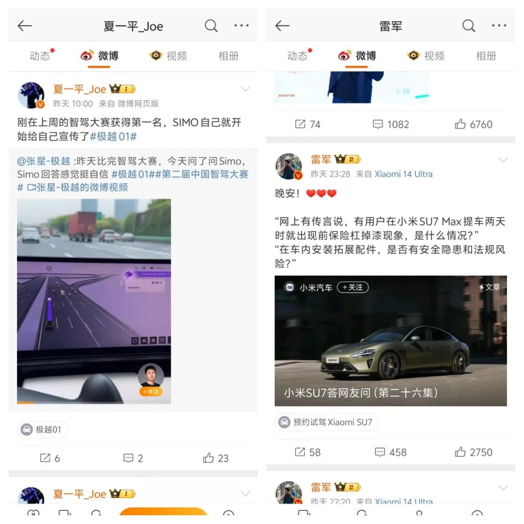 从营销手段来看,夏一平其实是在摸着雷军过河。比如雷军搞了个小米汽车答网友100问, 夏一平也从4月14日开始,进行SIMO十问十答—— 相比前者数百条评论,夏一平微博转发评论未超过20,对极越用户认知构建帮助并不大。