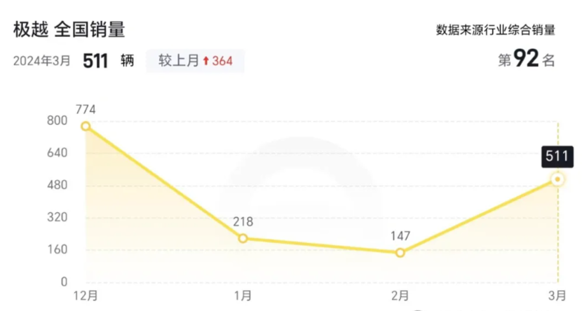 相关数据显示,2023年12月至2024年3月,极越汽车4个月共计1650辆,还比不上小米SU7的单周销量。作为和小米汽车同时正式立项,对标特斯拉Model Y全球唯二、国内唯一采用纯视觉智驾路线的智能纯电车,从成绩来看走到悬崖生死边缘。