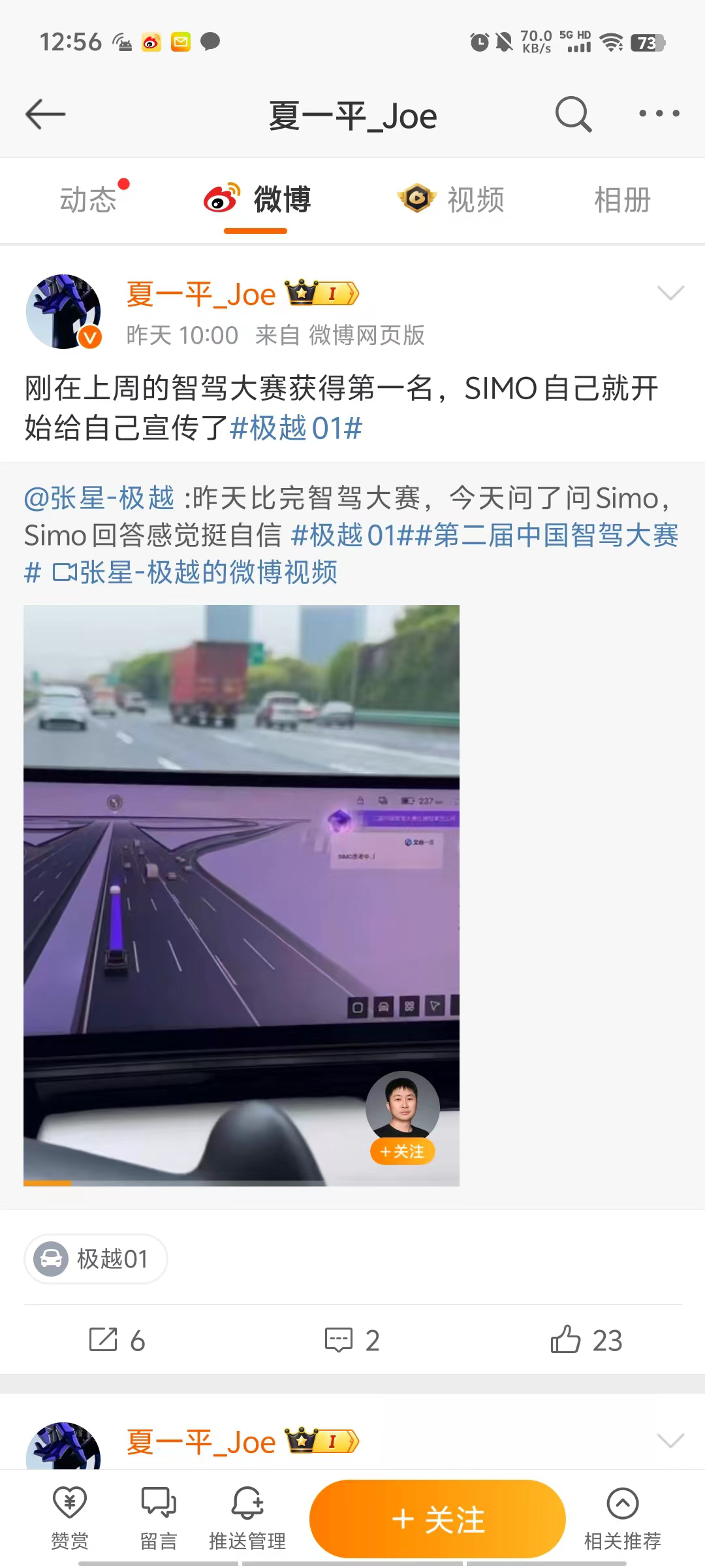 而在4月18日周鸿祎喊话友商提供“体验用车”后,夏一平也在微博毛遂自荐,@周鸿祎可以考虑下“汽车机器人”,强烈推荐“吉利和百度赋能的智能汽车”,但这条微博并未得到周鸿祎的回应,夏一平微博转发、评论数仅为21、43次,媒体报道的也少,可以说极越未能蹭到一点流量。